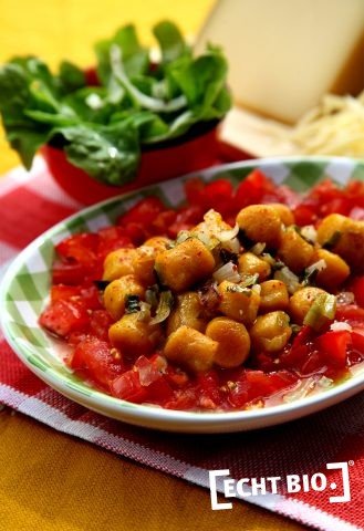 Sauce in tiefe Teller füllen, Gnocchi darüber geben und mit Chiliflocken bestreut servieren.